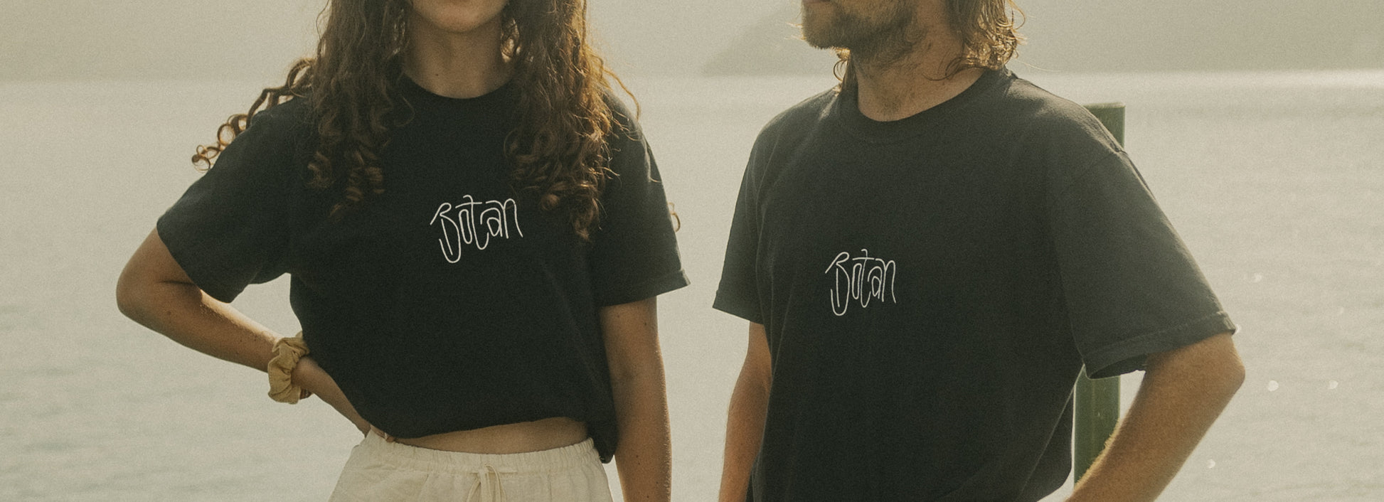 Black heavyweight embroidered "Botan" t-shirt. Katie is 5' 9" and wearing a medium. Austin is 5' 8" and wearing a large.